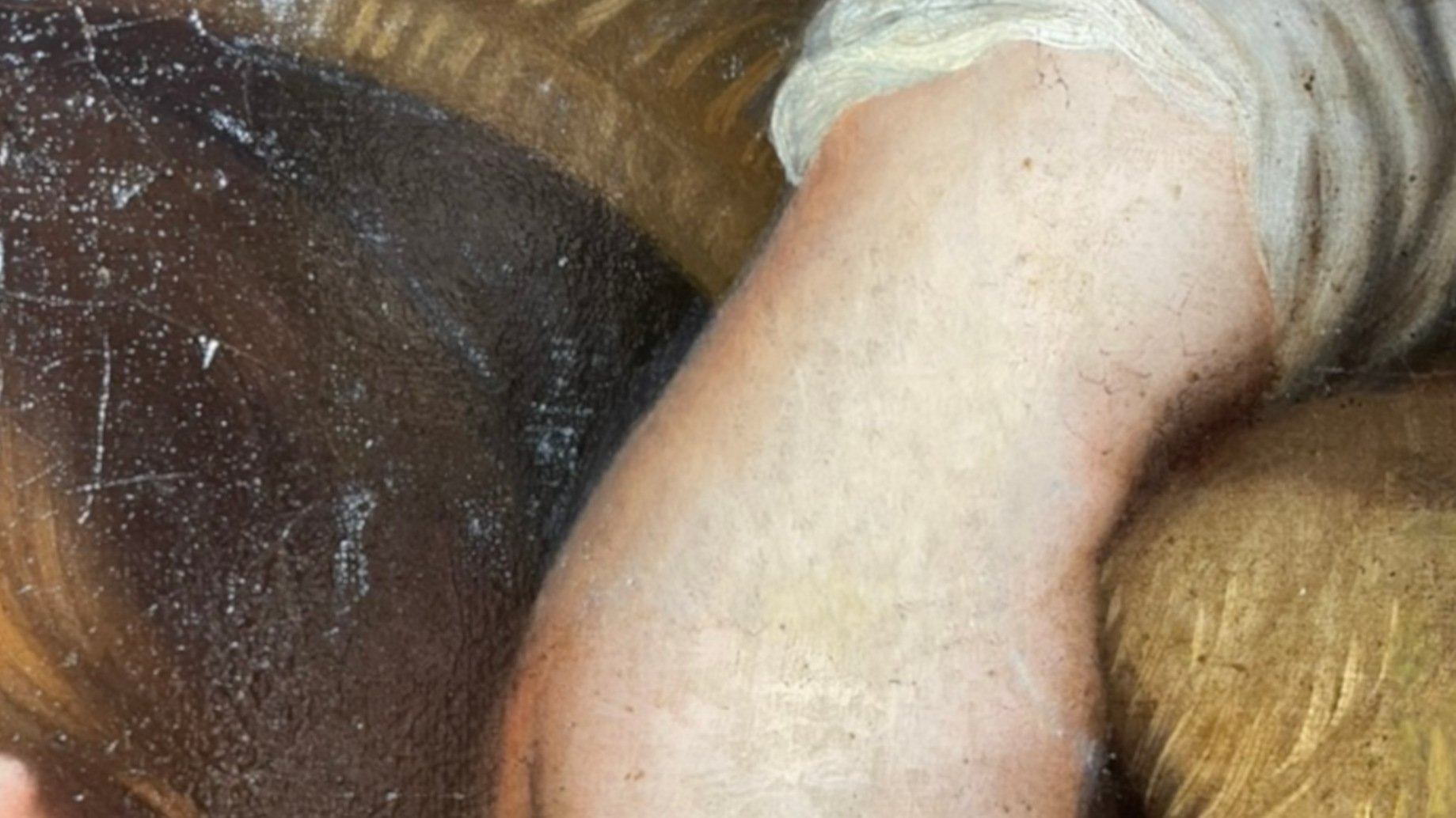 portrait peint dune vieillard avant restauration par l'atelier CROMA. vue en lumière rasante mettant en avant les altérations.